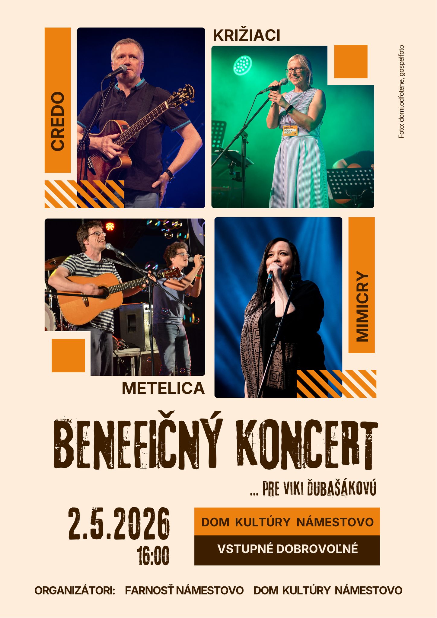 Vystúpia gospelové kapely Credo, Mimicry, Metelica a Križiaci, ktoré sa spojili práve pre túto výnimočnú príležitosť.
