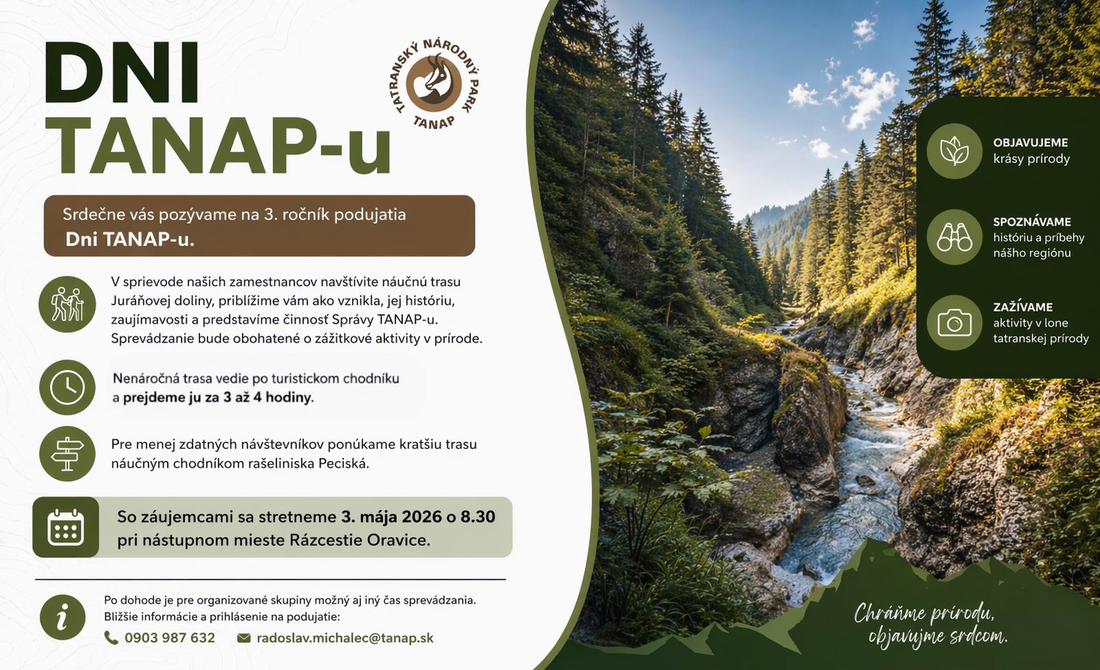 Srdečne vás pozývame na 3. ročník podujatia Dni TANAP-u. V sprievode zamestnancov TANAP-u navštívite náučnú trasu Juráňovej doliny. Stretnutie na Rázcestí Oravice v nedeľu 3. mája 2026 o 8.30 hod.